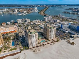 Coastal luxury resort style living at its finest in this beautiful Clearwater Beach condo! Experience breathtaking sunrises and sunsets from this beautifully updated two bedroom 2.5 bath corner unit boasting panoramic views of both the Gulf of America and Clearwater Bay. One of Clearwater Beach’s most desirable locations, this condo offers new luxury vinyl flooring, fresh coastal paint tones, designer lighting, plantation shutters, remote control shades, open concept flowing onto two private balconies. One overlooks the sparkling Gulf and Sugar Sand Beach and the other offers serene Bay views. The split bedroom design affords privacy for guests, both with en suite baths. Enjoy resort-like amenities to include a beautifully appointed clubhouse and kitchen, billiards room, grilling stations, heated pool and hot tub overlooking the beach, excellent fitness center with sauna and showers. 24 hour guarded security with on-site management and maintenance. All just steps away from award-winning restaurants, boutique shopping, and vibrant nightlife. Enjoy nightly sunset festivals with live performers at Pier 60, numerous annual festivals to include the Sugar Sand festival. Tampa International Airport and St Pete Clearwater airports are just minutes away, Walt Disney World, Universal Studios, Busch Gardens, Raymond James Stadium, Tropicana Field are all just a short drive from this beautiful property.