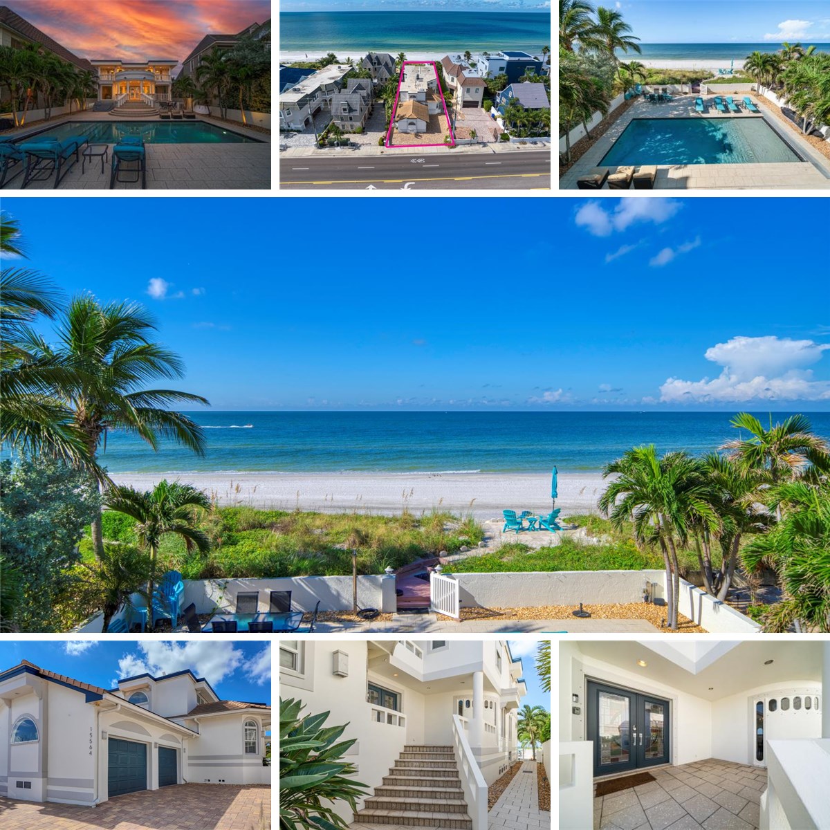 Discover refined coastal living in this stunning elevated Gulf-front residence on Redington Beach, where modern design meets breathtaking beachfront scenery. From the moment you enter through the striking double stained-glass doors, you’re greeted by an open, light-filled interior designed to showcase uninterrupted panoramic views of the Gulf. Expansive windows flood the home with natural light, creating a seamless connection between the indoors and the shoreline beyond. The sleek, contemporary kitchen is both stylish and functional, featuring a walk-in pantry and effortless flow into the dining and living areas, perfect for entertaining everything from intimate dinners to larger gatherings with family and friends. The primary suite is a true private retreat, offering a cozy sitting area, a private Gulf-view balcony ideal for morning coffee, and dual spa-inspired ensuite baths complete with a luxurious steam shower. Each guest bedroom is thoughtfully designed to provide comfort, privacy, and understated elegance. Step outside to experience exceptional Gulf-front living. The expansive outdoor space is designed for both relaxation and entertaining, featuring a sparkling pool to cool off after a day on the sand and a fire pit perfectly positioned for sunset gatherings overlooking the water. With direct beach access, sweeping Gulf views, and a steel-fortified seawall, this outdoor oasis invites endless enjoyment from lively celebrations to peaceful evenings by the shore. The home is outfitted with impact-rated windows throughout, complementing its modern design and light-filled interiors. Ideally located just minutes from local dining, shopping, and coastal conveniences, this residence offers modern amenities, sophisticated design, and unforgettable sunsets—embodying the very best of luxury beachfront living.