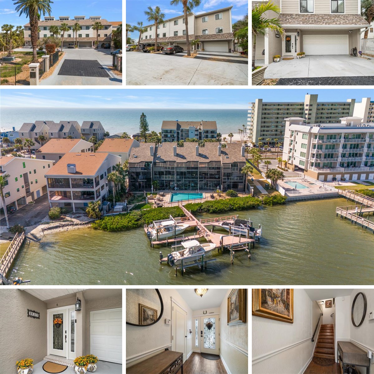 LOCATION, LOCATION, LOCATION! Boaters Paradise large deeded private dock and 20,000 lb boat lift on the Inter Coastal Waterway. The Highly Sought After Community of Port Royale of Indian Shores, a luxurious 3-story Townhome, 3-bedrooms, 3.5-bathrooms, 2-car garage, approximately 2400 sq ft htd, elevator, with water views from every floor off of your own private fully screened, added wind and water shades to assist in repelling rain and wind that are lowered and raised by remote control, tiled balconies. Also on 3rd floor is the Laundry Room with built-in fridge and According to the Sellers all features are: Custom aluminum railings and spiral staircase to all floors on exterior along with private elevator. A bonus/media room that may be used as a 4th bedroom with full bathroom on ground floor. Entire home remodeled, new impact rated windows and doors, new flooring, wood cabinetry, stone counters, custom moldings, upgraded designer lighting with dimmers on all fixtures. New water heater and water softner, 17-SEER A/C system with 10-year warranty, beautiful wood burning fireplace with imported Italian marble mantle and hearth. Your Primary Bedroom has vaulted ceilings and a private balcony, the bathroom is luxurious with its copper claw tub, copper sinks, huge travertine custom shower and shower floor is heated. A wonderfully appointed gourmet kitchen with new wood cabinets, granite, a cafe area, wine bar built-in wine cooler all black stainless steel appliances and eating areas within kitchen makes is a delight! Outdoor kitchen on main floor with custom cabinets, granite, mini fridge, sink and large electric grill. The townhouse has a new roof, seawall, new pool pumps and pavers, privacy fence around entire property, latest update it 6' water barriers at all first story entrance and exit points both front and rear of property giving the home additional safety from potential storm surge waters. All State mandated milestone inspection and reserve study passed and attached. The remote control shades on all floors and water barrier installed on 7/2025. NO RENTALS ALLOWED AND REQUIREMENTS FOR FLORIDA BUILDING SAFETY ACT HAVE BEEN PERFORMED AND AVAILABLE FOR REVIEW.