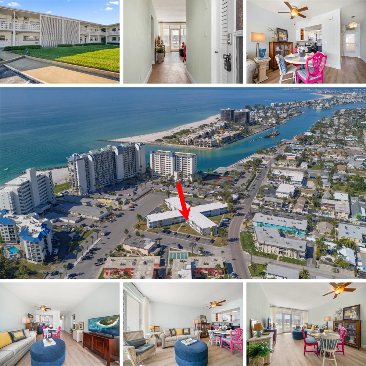 **Fully Remodeled in 2025!** SELLER IS OFFERING $3500 TOWARDS BUYER'S CLOSING COSTS.**This stylish 1BR/1BA condo is perfectly positioned right across the street from St. Pete Beach in the coveted Upham Beach area. Perfect for a weekend getaway or full-time residence. Enjoy an inviting open floor plan, luxury vinyl flooring, and a beautifully updated kitchen featuring stainless steel appliances, tuxedo-style cabinetry (blue lowers & white uppers), natural stone countertops (Quartzite), wine display shelves, and a spacious pantry closet. The modern bathroom offers a **walk-in shower** and stunning porcelain penny round tile flooring.
